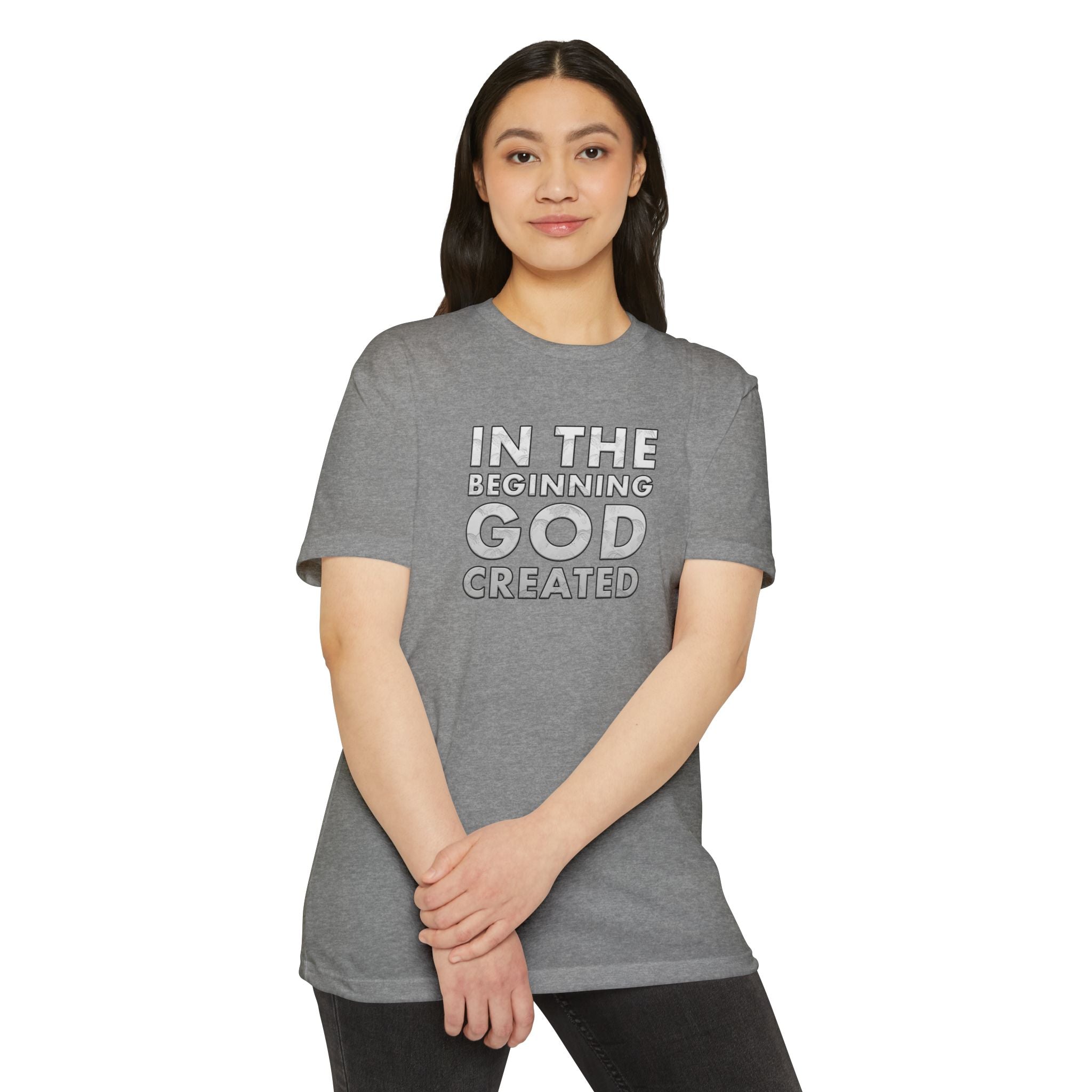 Soft, light, and quietly expressive — this classic tee carries a gentle message for readers and faith-minded folks alike. The front-center design layers a warm collage of book spines behind bold, hopeful lettering: “In the beginning God created.” Wear it to cozy mornings with a mug and a stack of books, to church study groups, or while shelving new finds at the library. The breathable, slightly heathered fabric drapes easily and keeps you comfortable through long days of conversation or quiet reflection. It’s a subtle conversation starter that feels like a favorite well-loved book — familiar, thoughtful, and calm.