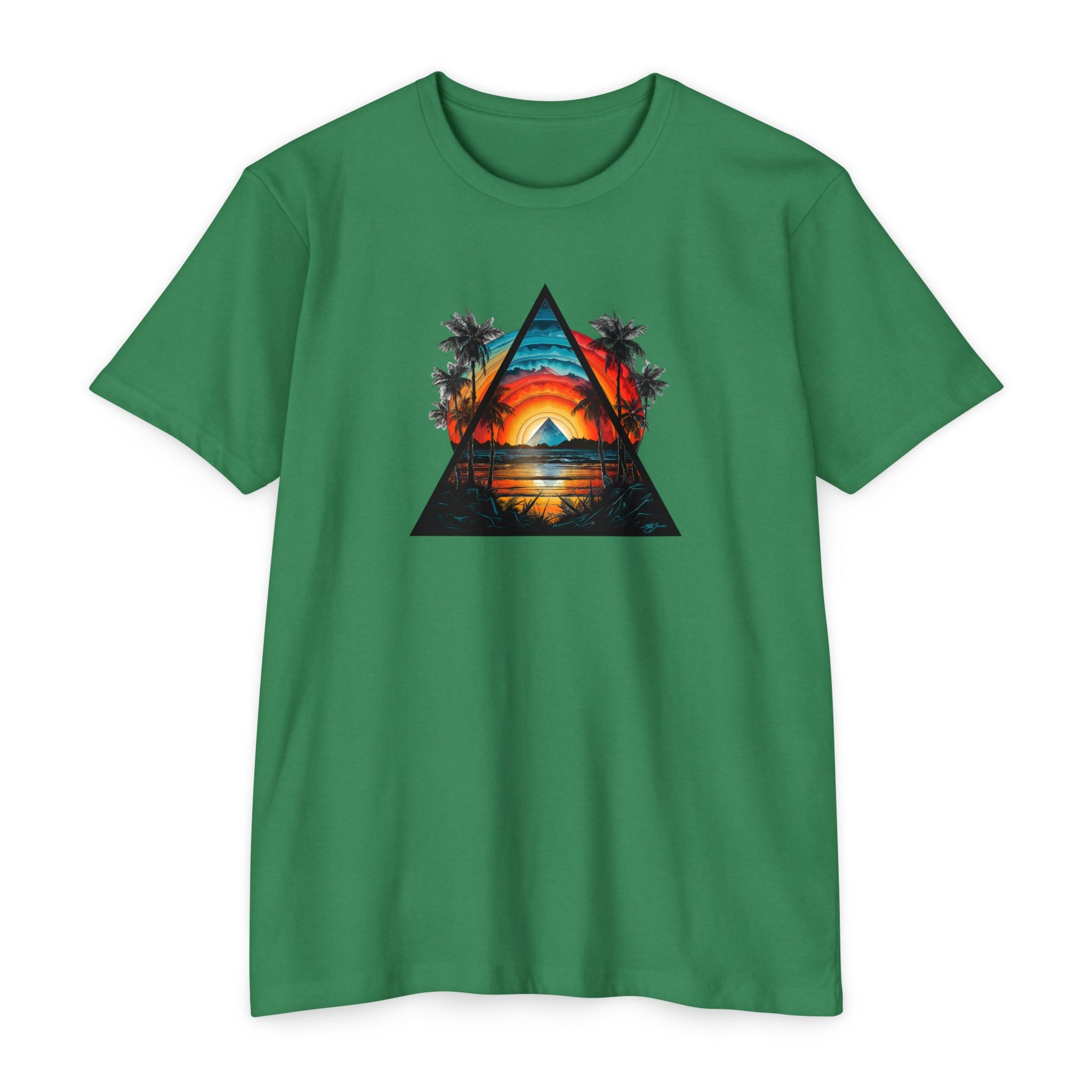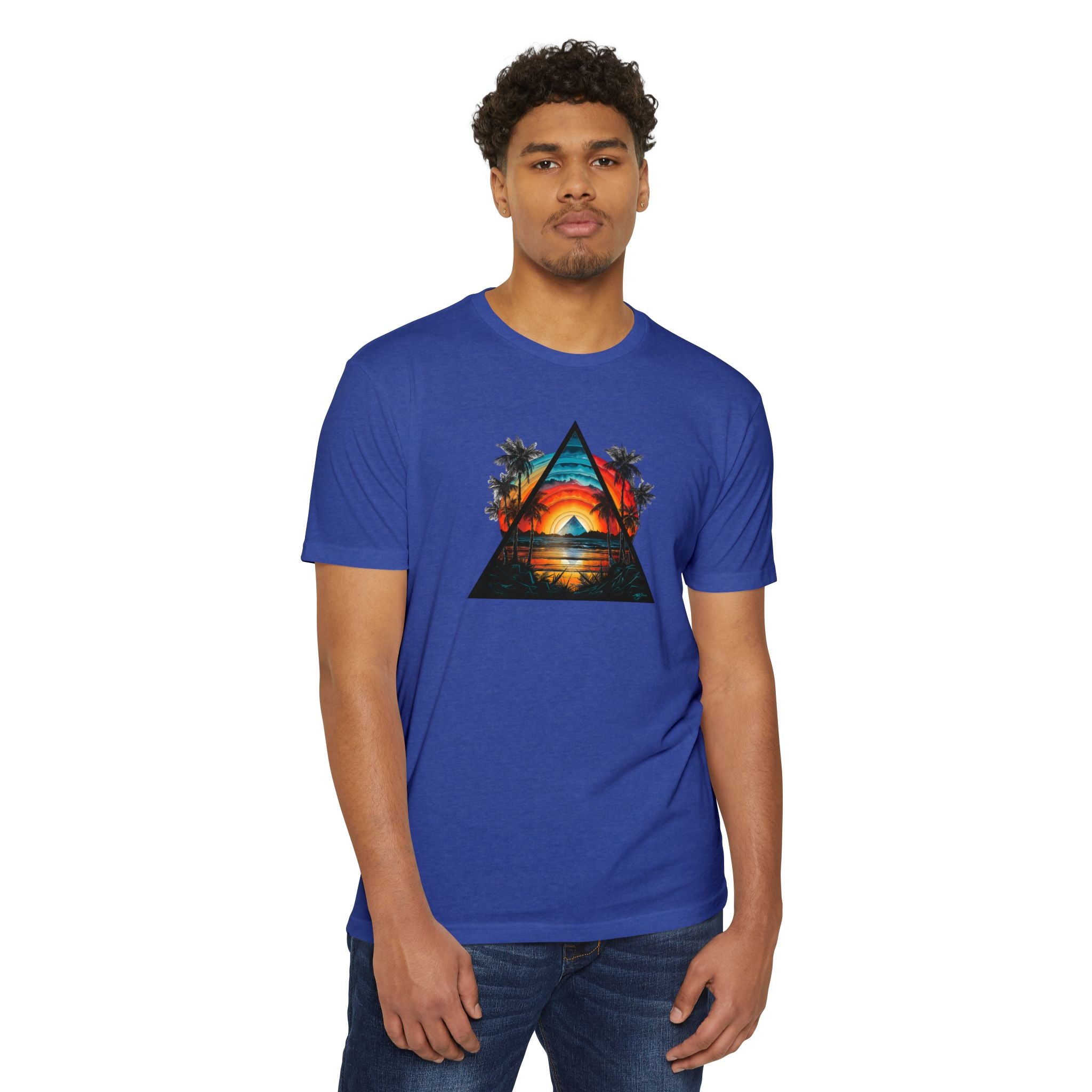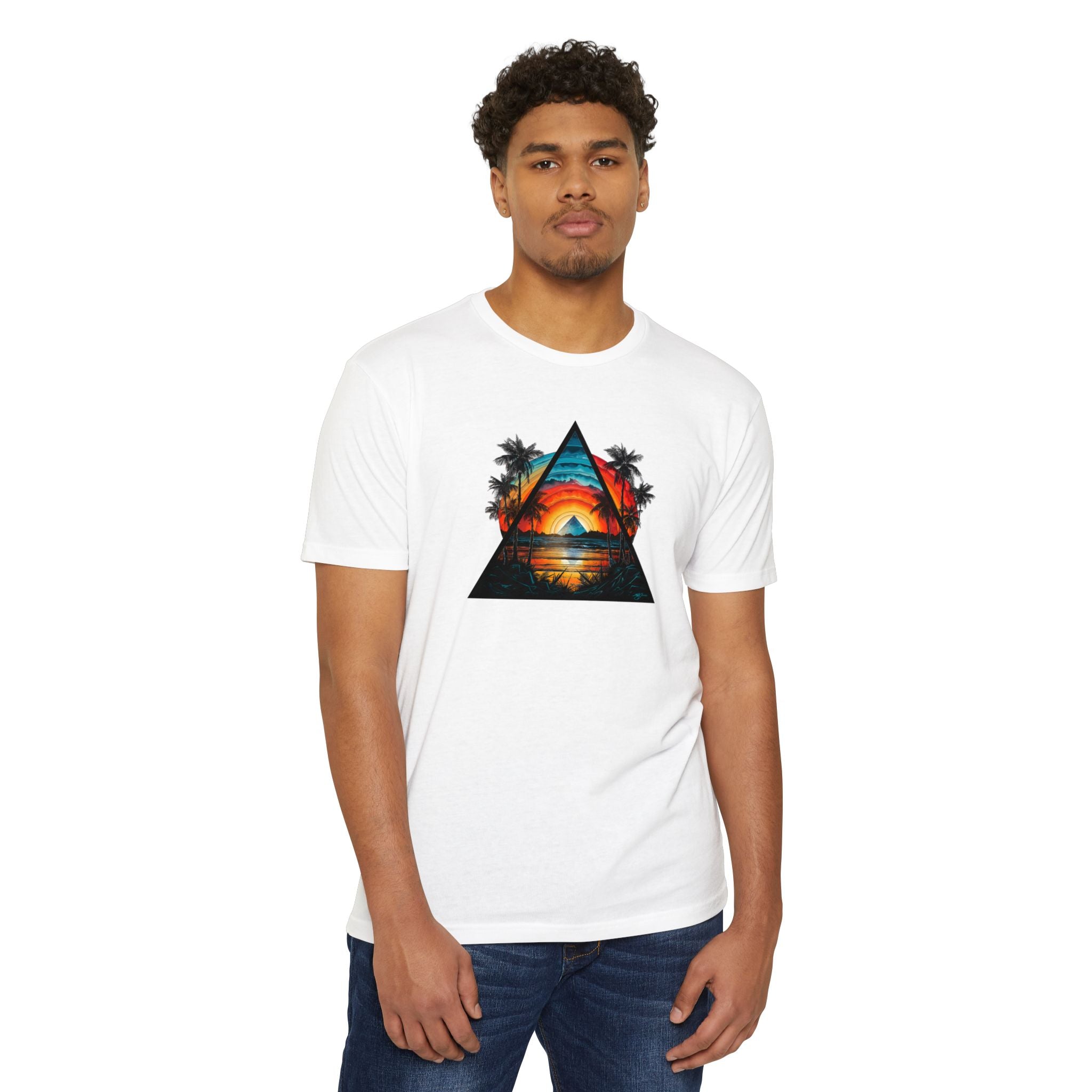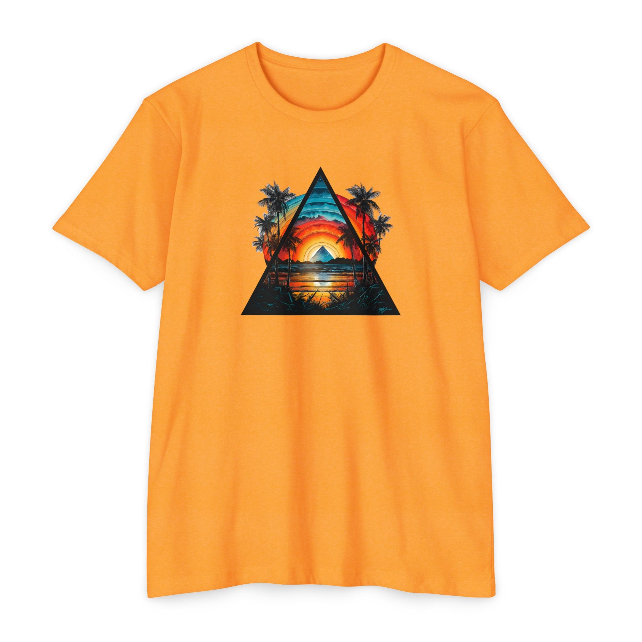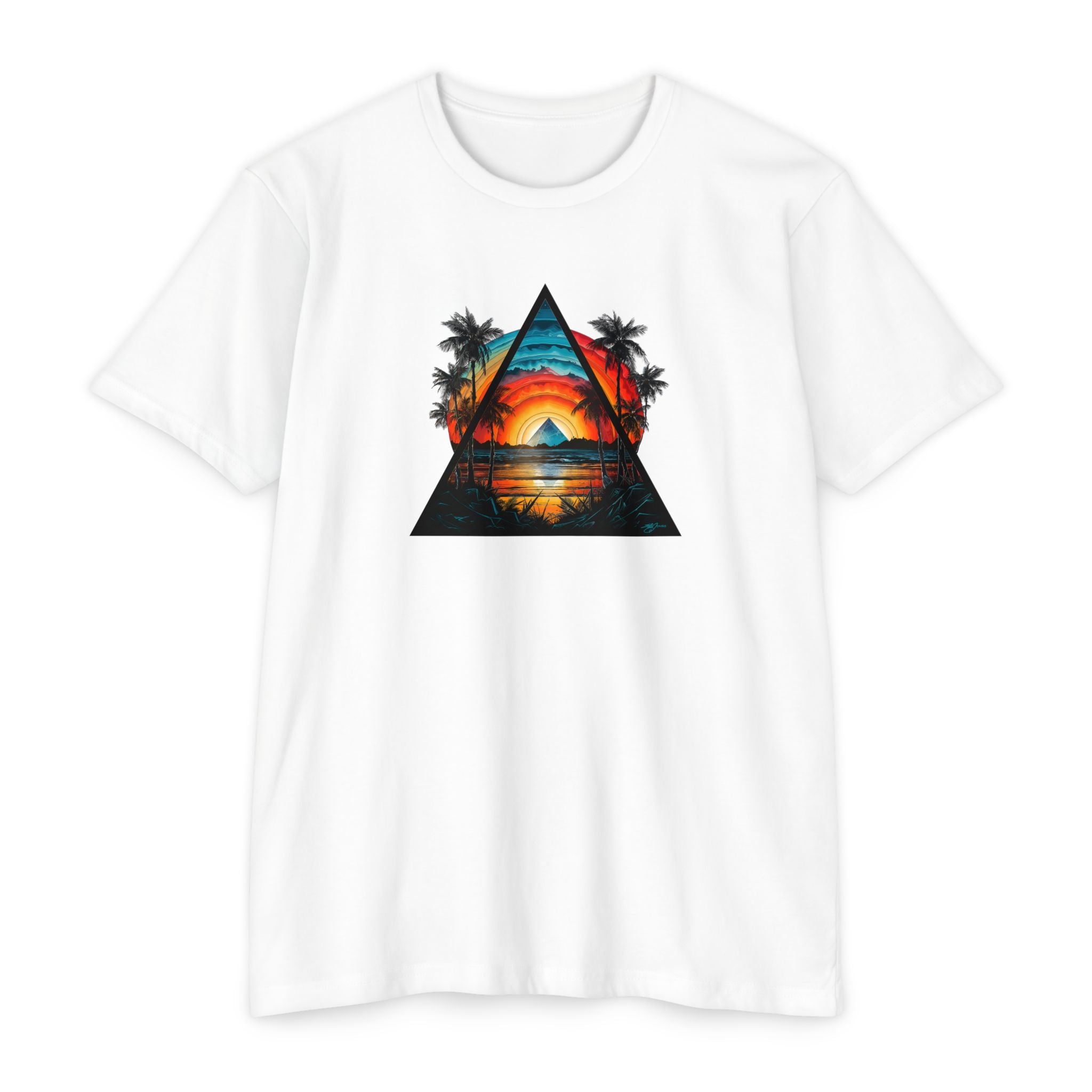 This lightweight tee brings a slice of sunset coastlines to everyday wear. A vibrant triangular print captures a warm orange-and-teal sunset framed by palm silhouettes and mirrored water, evoking slow evenings by the shore and road-trip playlists. The classic fit and soft, combed ring-spun cotton blend make it feel lived-in from the first wear — breathable on warm days and easy to layer when the air cools. Wear it to lean into a relaxed, summit-to-surf mindset: strolls on the boardwalk, campfire nights, or long drives where the sun dips low and everything slows down.