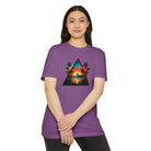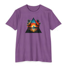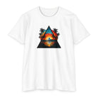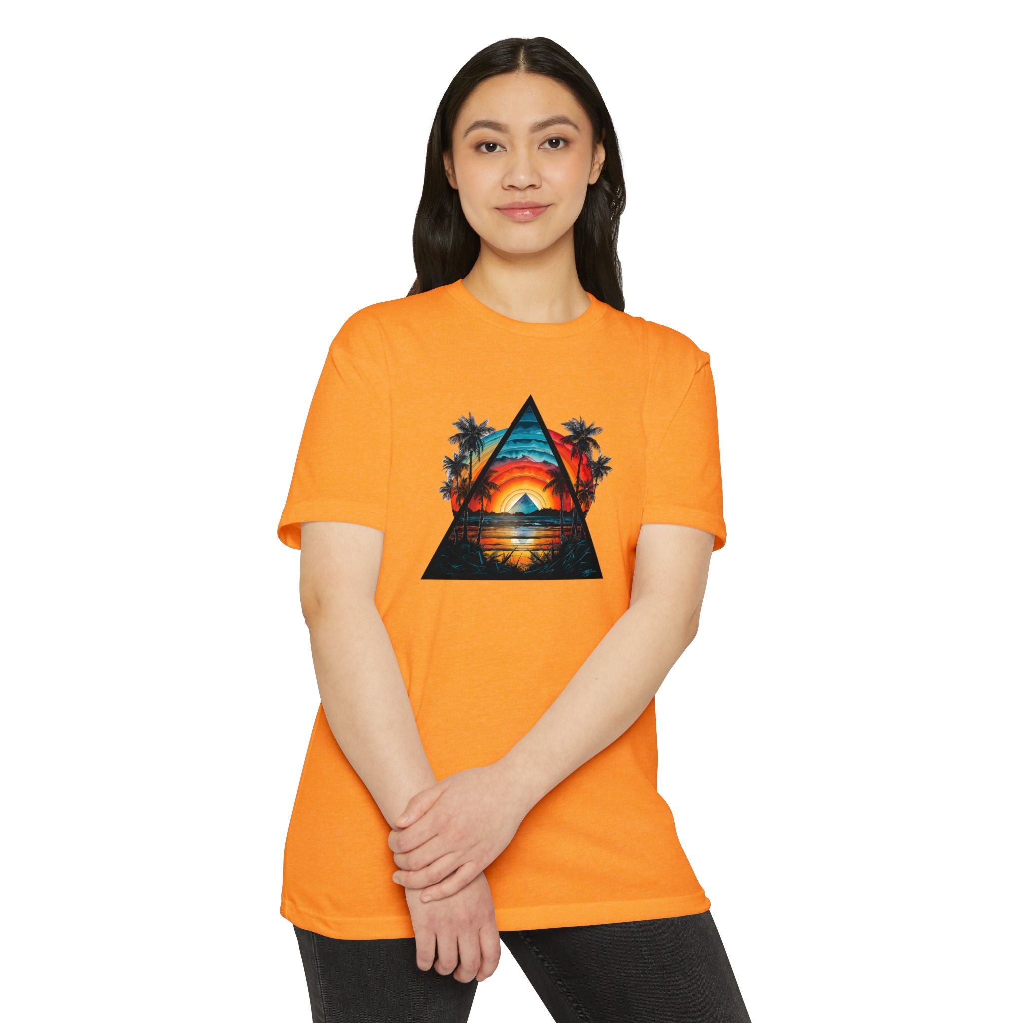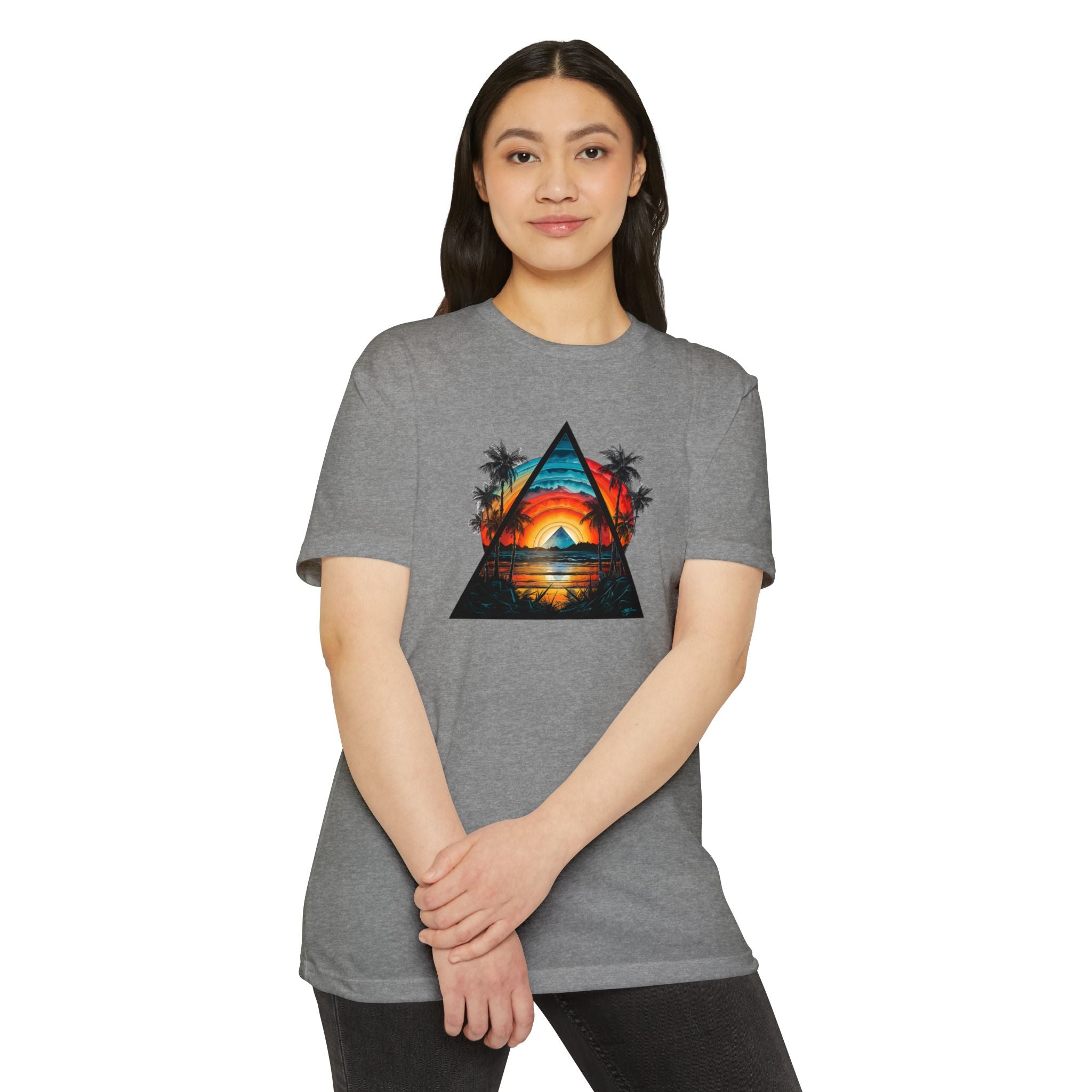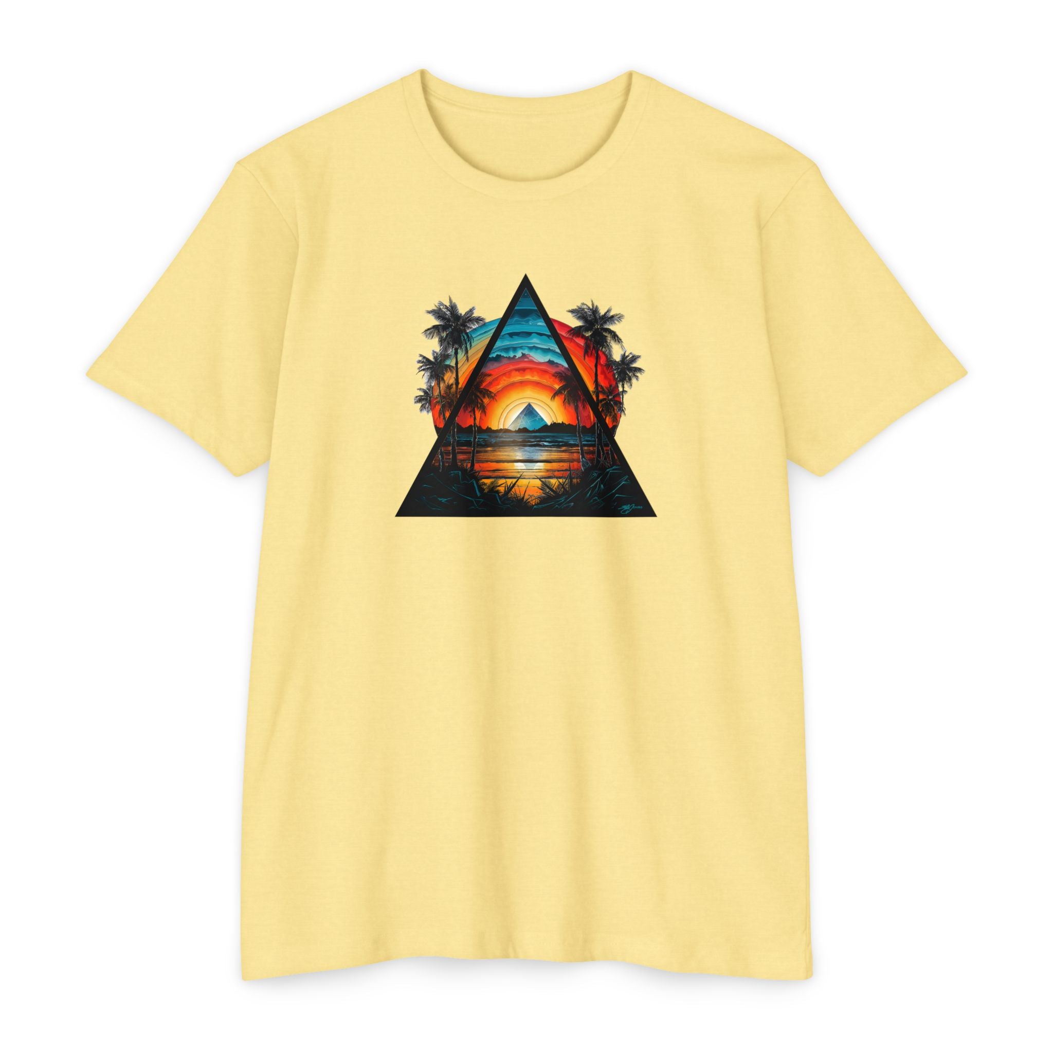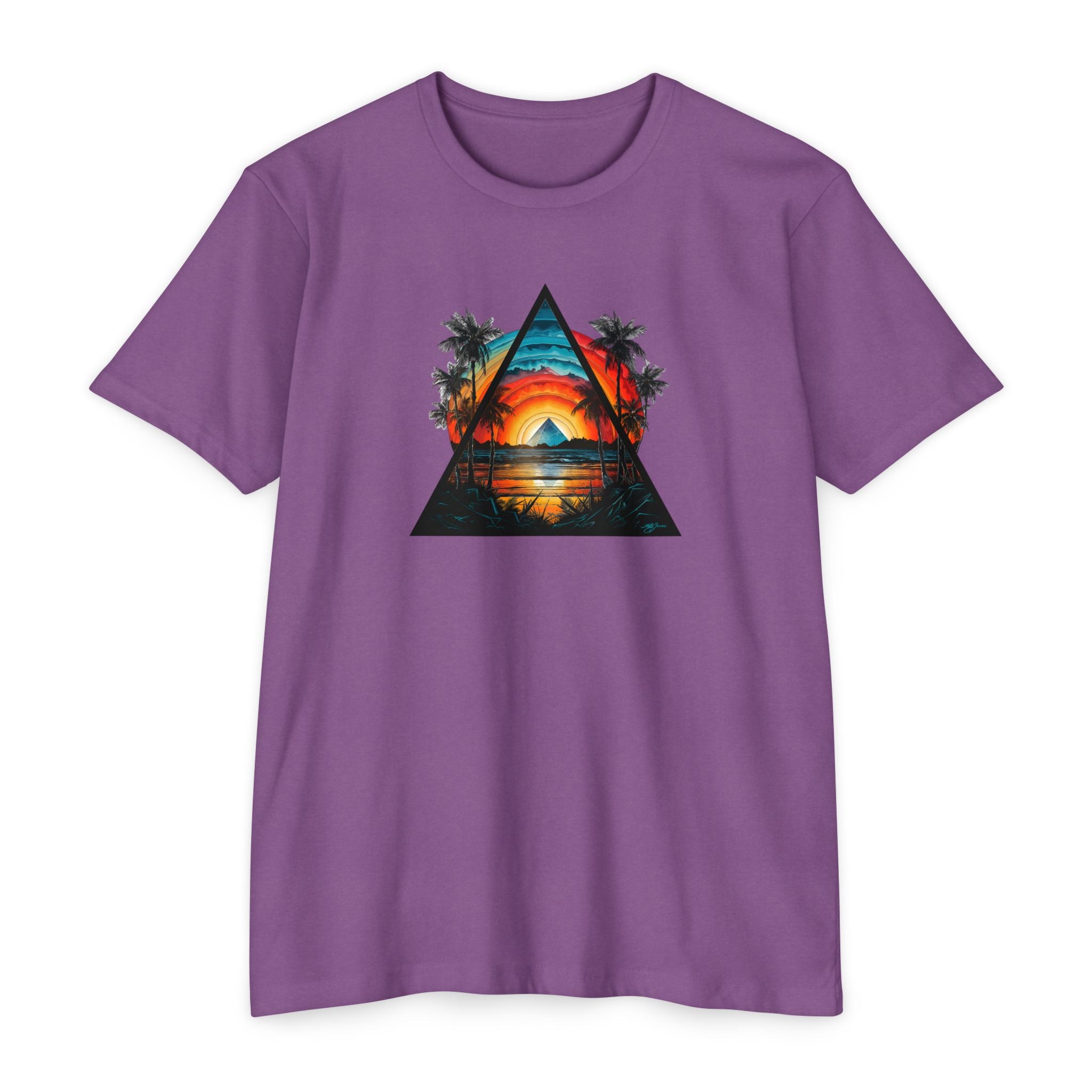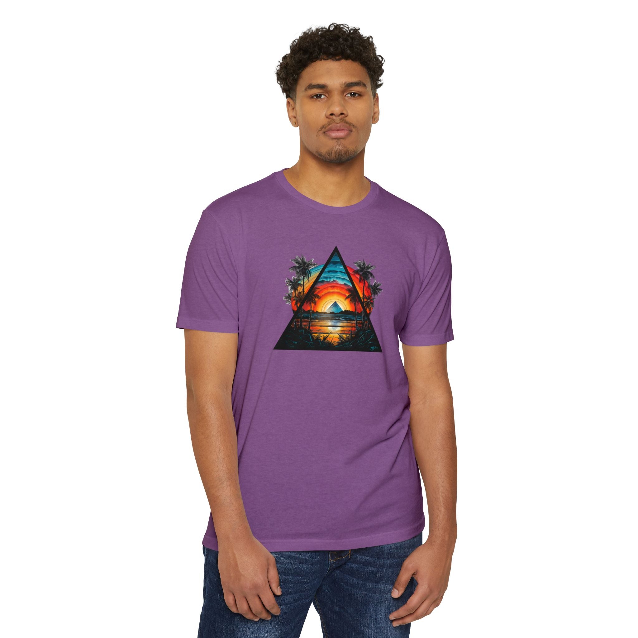This lightweight tee brings a slice of sunset coastlines to everyday wear. A vibrant triangular print captures a warm orange-and-teal sunset framed by palm silhouettes and mirrored water, evoking slow evenings by the shore and road-trip playlists. The classic fit and soft, combed ring-spun cotton blend make it feel lived-in from the first wear — breathable on warm days and easy to layer when the air cools. Wear it to lean into a relaxed, summit-to-surf mindset: strolls on the boardwalk, campfire nights, or long drives where the sun dips low and everything slows down.